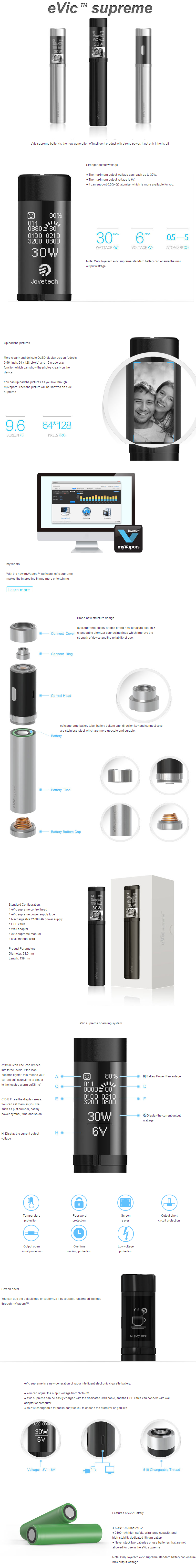 Το eVic Supreme ® είναι η νέα γενιά ευφυών προϊόν με περισσότερη δύναμη. Όχι μόνο έχει κληρονομήσει τα καλύτερα χαρακτηριστικά του Joyetsch eVic, είναι επίσης προικισμένο με το δικό του σύνολο από χαρακτήρες: